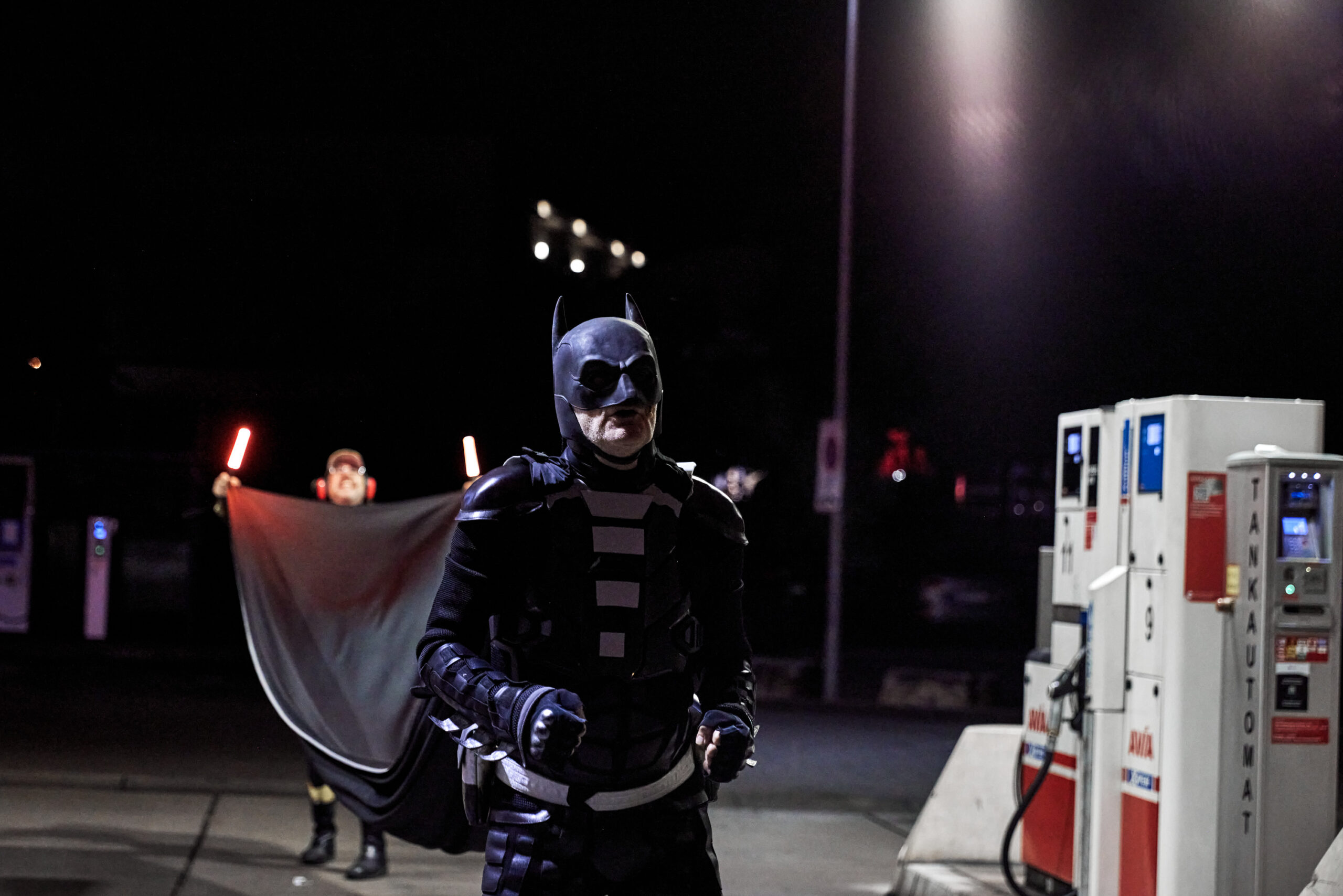 So zuckelt der Bus durch Stuttgart und Umgebung, von Ampel zu Ampel, und ein bisschen schneller die B10 entlang. Wenn er hält, sind die zwei Superhelden schon da: Etwa an der grauen Schwelle eines Hochhauses, von dem sich der Original-Batman ja gerne mal hinunterstürzt, machen sie gymnastische Übungen, parlieren in Comicsprech („Seufz, ächz, stöhn“) und über ihre Zipperlein – Herkules hat Rücken, Batman Panikattacken und eine Menge „Phantomschmerzen“. Sie gehen halt aufs Rentenalter zu. Am düsteren, menschenleeren Neckarhafen, wo die Arbeiter:innen längst Feierabend haben, übt Herkules Golfen und duettiert mit Batman: „Jede Zeit hat ihre Helden, jeder Held hat seine Zeit, um mit der Zeit zu gehen.“ Oder: „Wir waren die Guten, zumindest gegen die Bösen.“ Die beiden sind müde. Heute würde er was anderes machen, sagt Herkules, Künstler werden, Bob Dylan oder Tom Waits oder so. An einer Tanke beenden sie ihr Heldentum. „Wir gehören uns nicht.“ Ohne Kostüm seien sie nackt. „Sei du selbst.“ Batman bricht den Start zum Abflug ab, beide entledigen sich ihrer Kostüme und verziehen sich in Richtung Kentucky Fried Chicken.