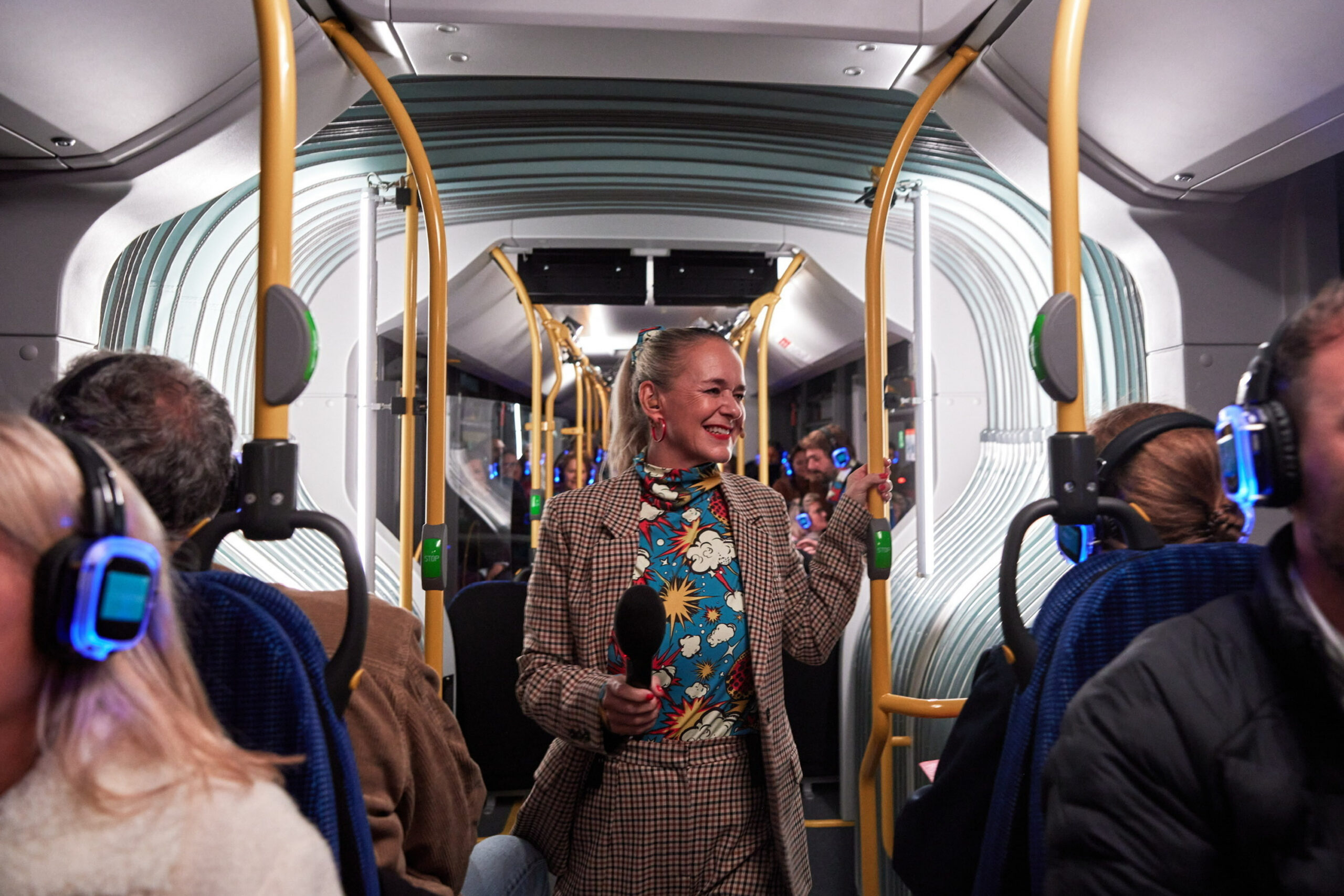 Die „Reiseleiterin“ spielt Kathrin Hildebrand, sie läuft während der Fahrt den Mittelgang hin und her. Conférencière, Moderatorin, Sängerin, Darstellerin zugleich, ist sie für den poetischen Teil des Abends zuständig, rezitiert schöne Verse als Hommage an die Großstadt (Texte: Alexander Steindorf), erzählt von den „Räumen dazwischen“, in die man hineinhören solle, die Platz böten für neue Geschichten. Die Stadt sei ein „Buch“, ein „funkelndes Wimmelbild“. Und sie befragt Zuschauer:innen nach ihren Held:innen der Kindheit: Michel aus Lönneberga, Pippi Langstrumpf, Pumuckl, Alfred E. Neumann, Jim Knopf. Hmmmmh.